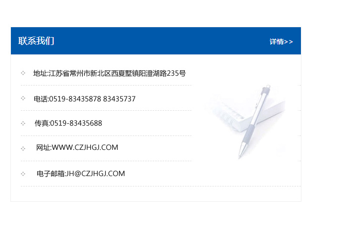 地址:常州市新北區友邦商務大廈1幢16、17層  電話:0519-85101652  傳真:0519-85112595  郵編:213022  網址:www_cz-jiayue_cn.ebei88.com  郵箱:xiajifengaa@163.com